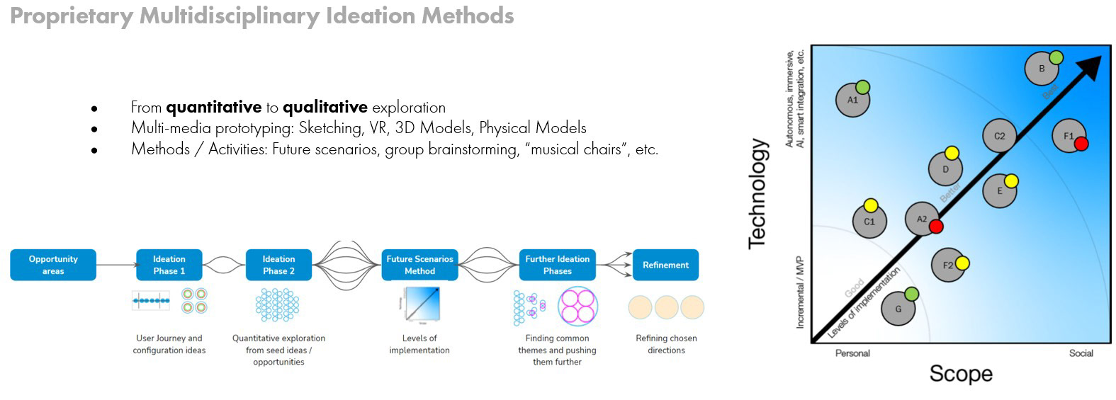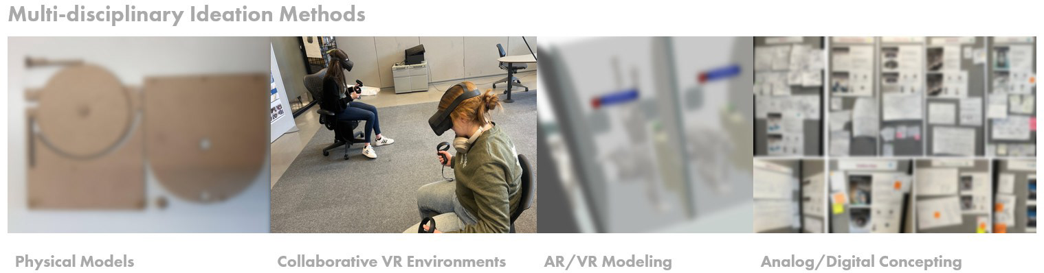 In this phase, research insights were translated into testable concepts across multiple levels of fidelity, enabling rapid exploration and validation of future aviation experiences. The team applied proprietary ideation and "multi-level prototyping" methodologies to develop concepts across analog, physical, digital, AR, VR, and XR environments, complemented by structured co-design sessions with industry partners.