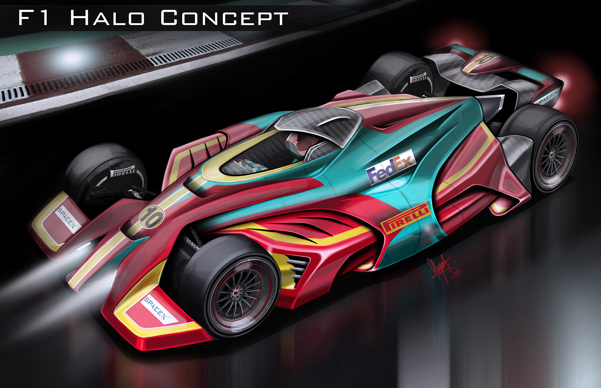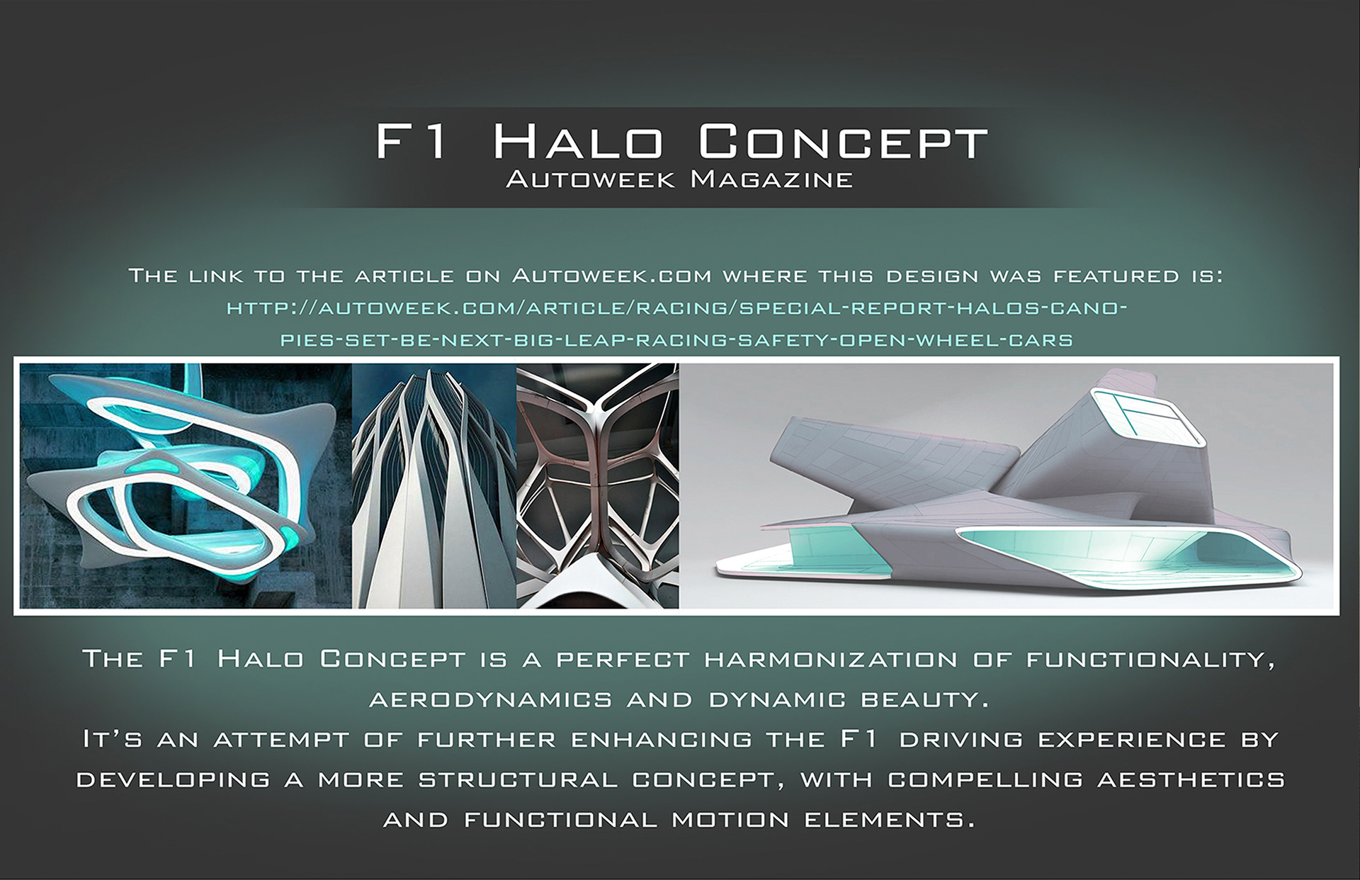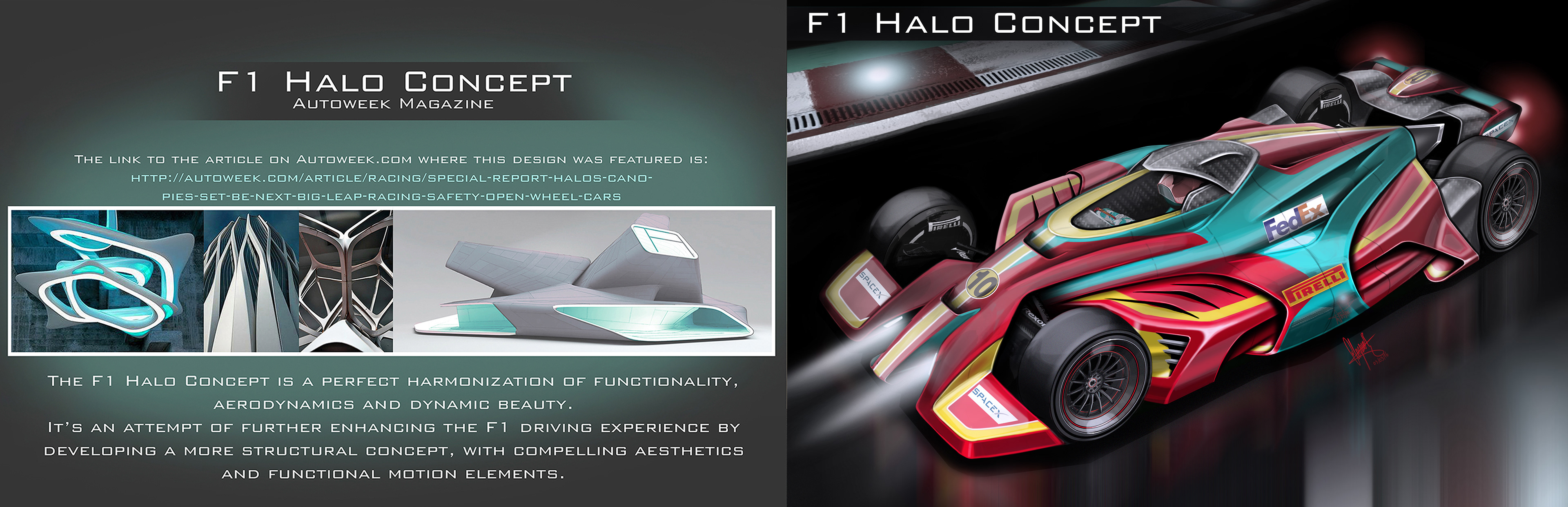 The F1 Halo concept was a project proposed by Autoweek magazine and several Formula One brands, in which the premise was to design a futuristic F1 vehicle that incorporated a Halo or Canopy around or above the driver. This synthesis of the F1 Halo project intends to explore an entirely new aerodynamic form language as well as incorporate new technologies and the Halo structure above the driver.