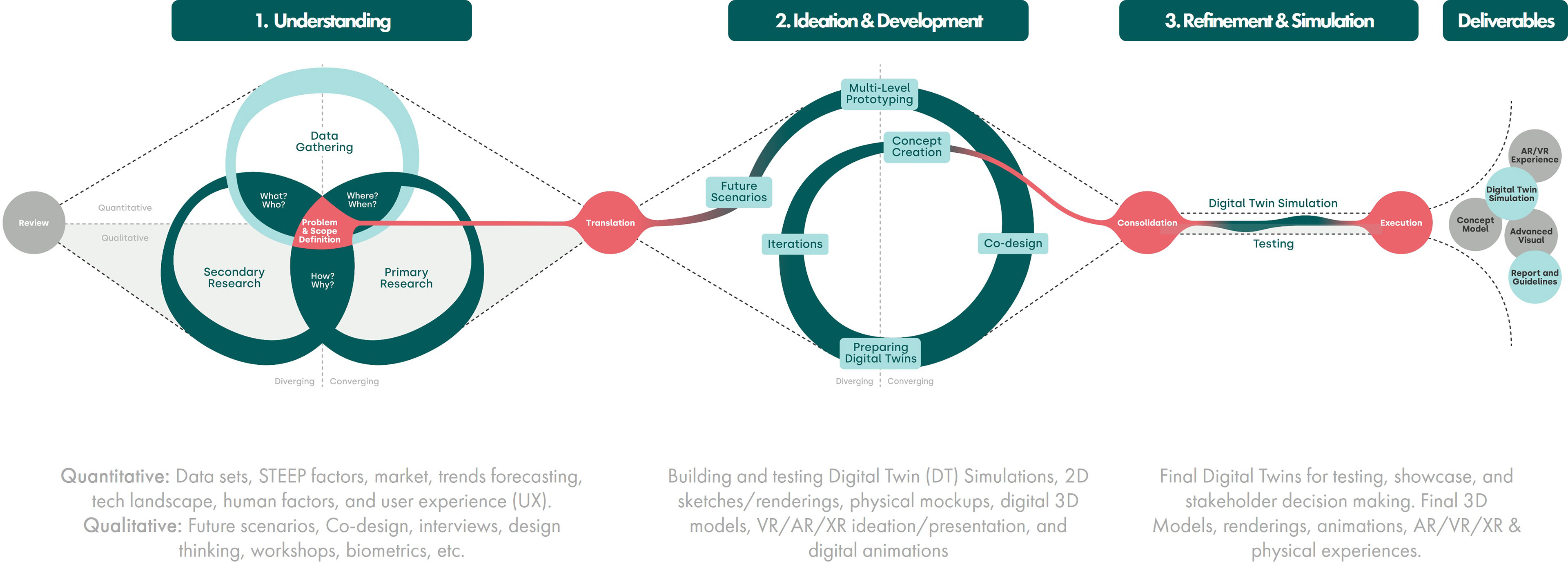 The second phase translates insights into ideas through structured ideation and experimentation. We apply proprietary frameworks such as multi level prototyping, Digital Twin ideation, and participatory co design to explore multiple possible solutions. Concepts are developed and tested through 2D sketches, physical mockups, digital 3D models, immersive AR, VR, and XR experiences, animations, and early Digital Twin simulations. This phase enables rapid learning, comparison of alternatives, and early validation with stakeholders.