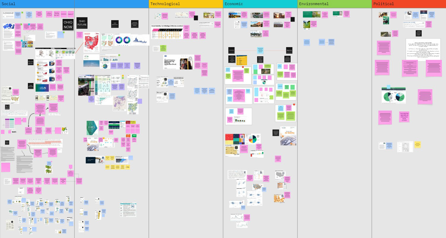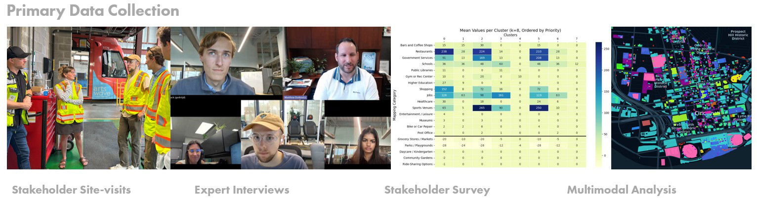 This phase focused on establishing a human centered and data informed understanding of mobility access, service gaps, and community needs across urban, suburban, and rural contexts in Ohio. Primary research included IRB approved stakeholder interviews, statewide surveys, and on site observations with residents, planners, transportation experts, and local leaders. Secondary research incorporated STEEP analysis, trends forecasting, policy review, and spatial and land use analysis, supported by GIS datasets and regional planning tools.