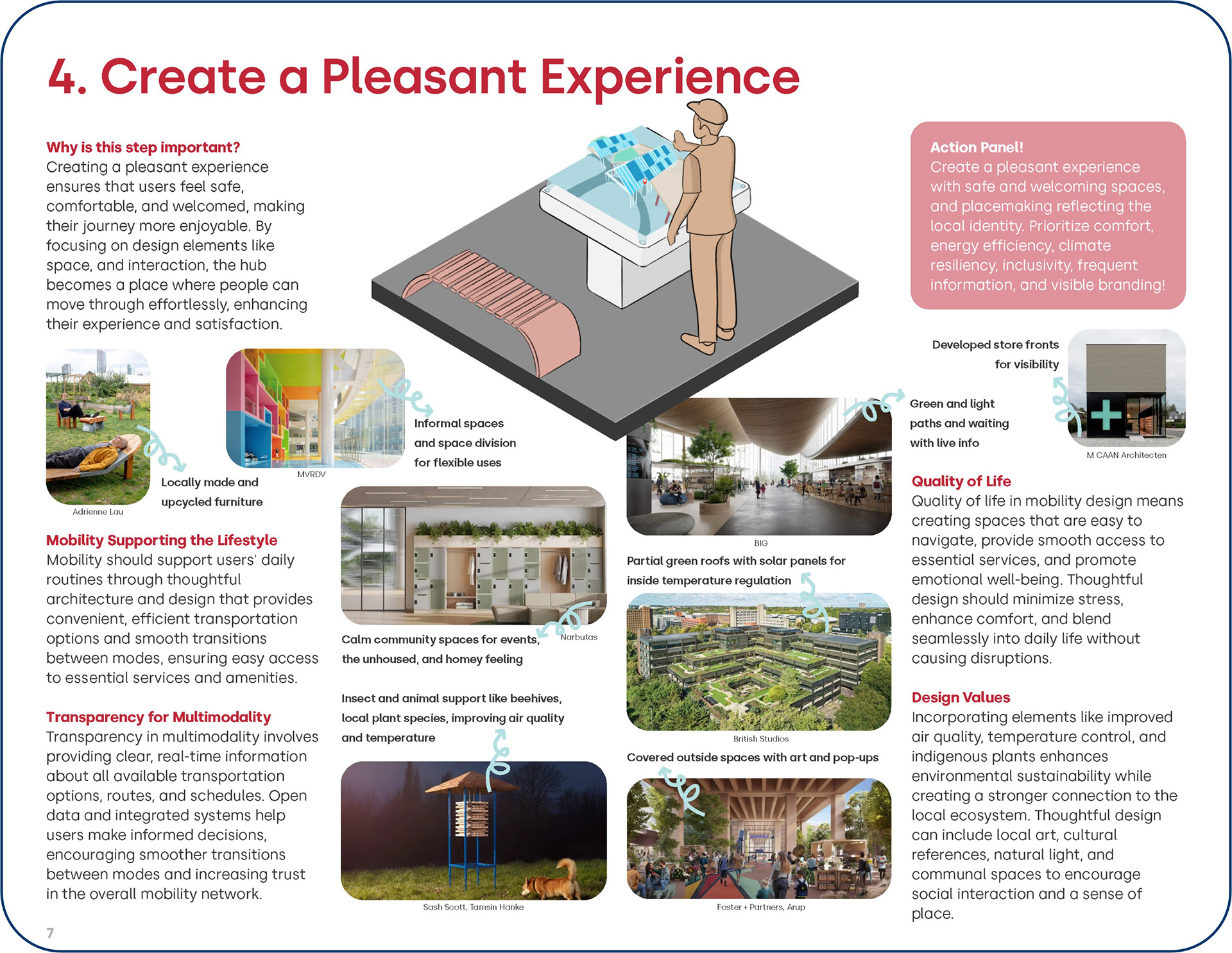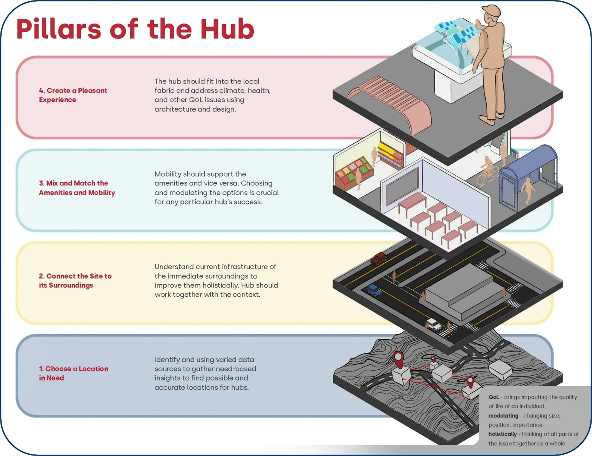 The Future Hub Playbook is structured around 4 interconnected pillars that guide stakeholders through the planning and design of community and mobility hubs in a clear, accessible, and participatory way. Each pillar builds on the previous one, moving from understanding community needs and context, to defining hub typologies and priorities, to translating insights into design and programmatic decisions, and finally to exploring and validating scenarios through Digital Twin visualizations. Each pillar is supported by research insights, visual Digital Twin examples, and practical checklists that help stakeholders navigate complex design and planning decisions.