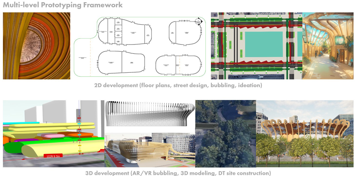 To refine scale, proportion, and spatial interaction, collaborative AR and VR bubble exercises were conducted in Gravity Sketch, allowing teams to evaluate designs from a human perspective before committing to detailed development. Concepts were further contextualized using local data sets, including land use, mobility patterns, and demographic information, and iteratively validated through research feedback. This approach ensured that each hub concept remained grounded in stakeholder needs, future scenarios, and real world constraints while supporting flexibility and scalability across contexts.