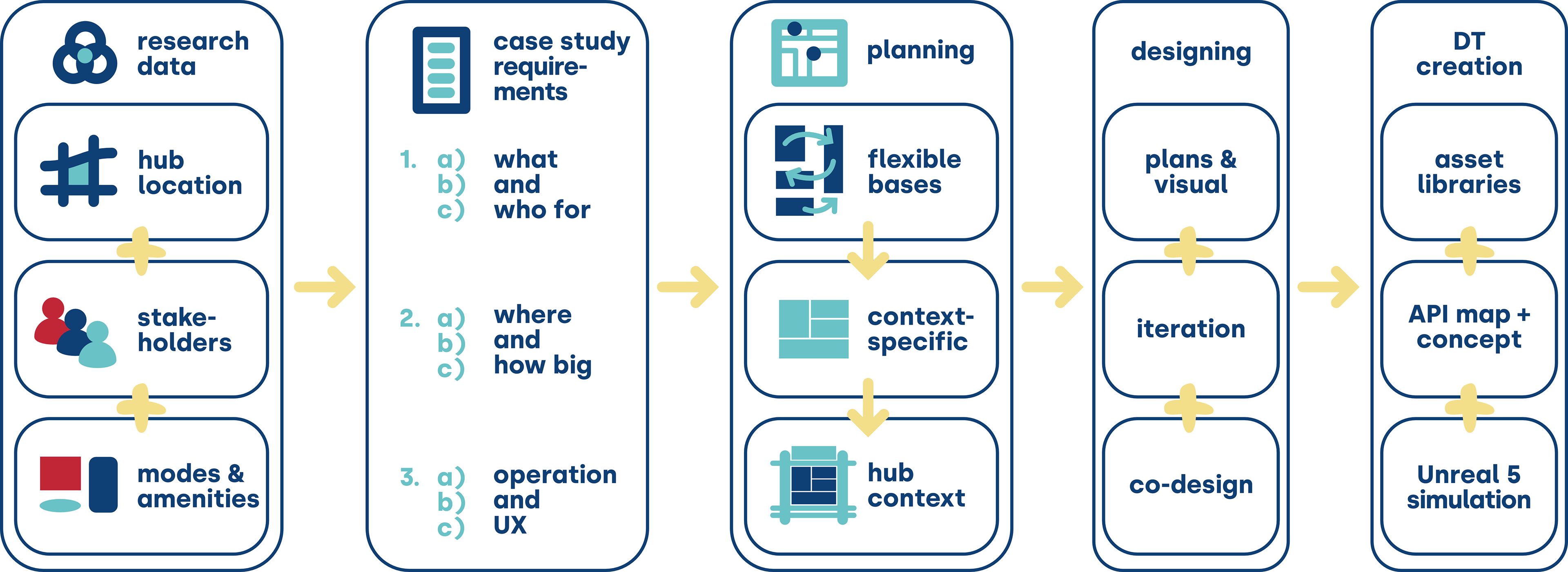 The resulting design concepts formed the foundation for Digital Twin creation, enabling data driven ideas to be translated into immersive, spatially accurate environments. These Digital Twins supported comparison, validation, and stakeholder engagement, allowing communities and decision makers to visualize scenarios, assess trade offs, and participate meaningfully in shaping future hub solutions.