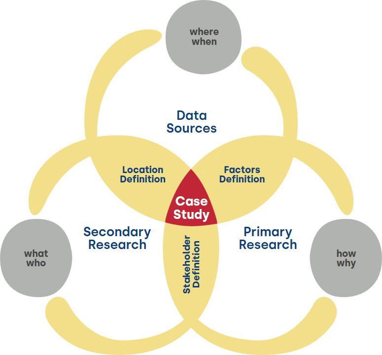 To define representative case studies across Ohio, the team applied a proprietary three way Venn diagram methodology that systematically integrates primary research methods, secondary research methods, and contextual data sets. Primary inputs included IRB approved interviews, surveys, and field observations that captured lived experiences, needs, and priorities of diverse populations. Secondary inputs incorporated STEEP analysis, policy review, trends forecasting, and precedent studies, while quantitative data sets such as GIS, land use, demographic, and mobility data provided spatial and statistical grounding.