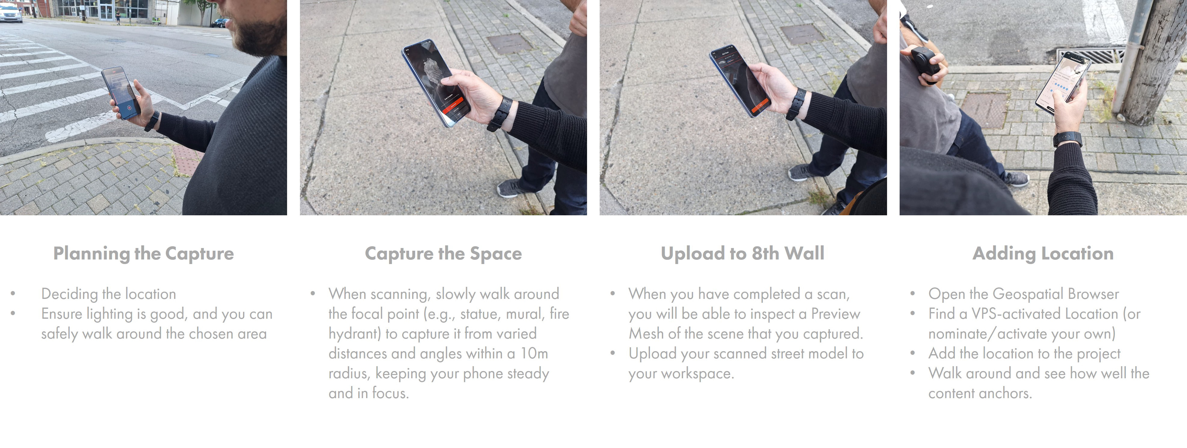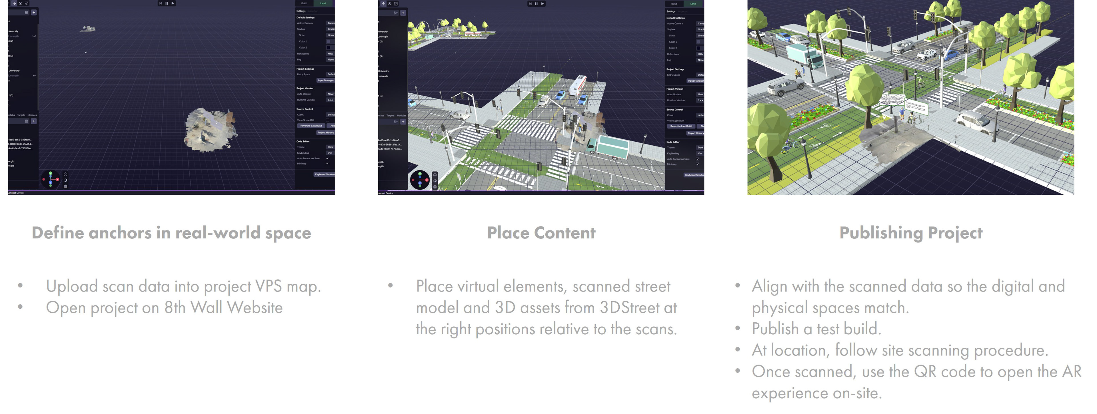 The second phase centered on preparing the technical assets and participatory materials required for the pilot. This included selecting the final test location and generating accurate spatial data through scans and surveys. Using these inputs, the team developed a detailed 3D urban street model representing an improved future condition, incorporating enhanced multimodal mobility access, green and urban infrastructure, and mixed use development strategies. These designs were translated into a mobile AR experience using the selected toolchain, ensuring that participants could visualize and interact with future scenarios directly on site and at a human scale.