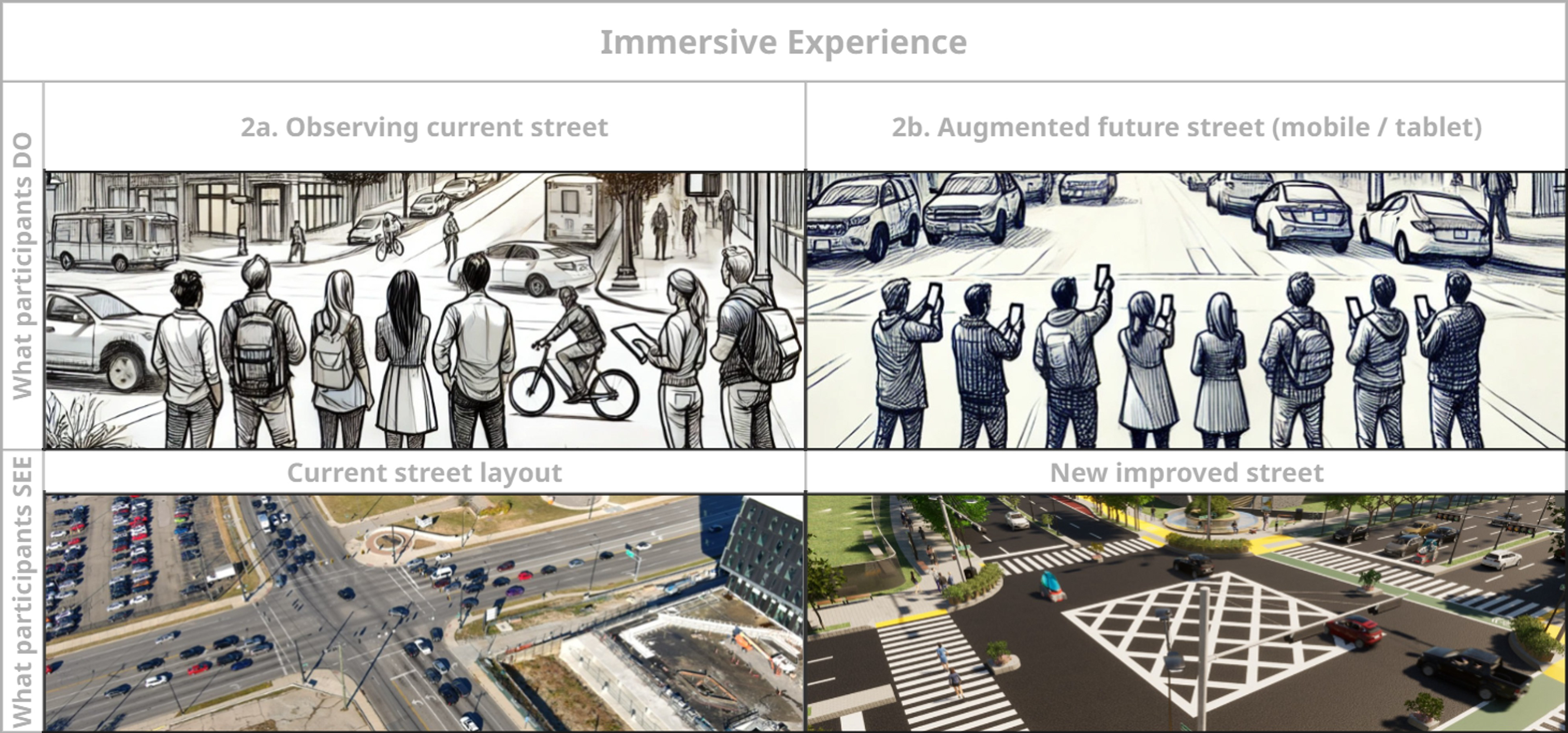 The third phase consisted of the live, on site participatory session where all methodological components were tested together. Community members, stakeholders, and decision makers were guided through a structured facilitation process that combined storytelling, AR visualization, and mixed methods data collection. Participants engaged with both the current and proposed future street conditions, providing qualitative feedback, reactions, and insights informed by their lived experience. This phase also assessed the effectiveness of the tools, facilitation structure, and data collection approach, identifying strengths, gaps, and opportunities for refinement.